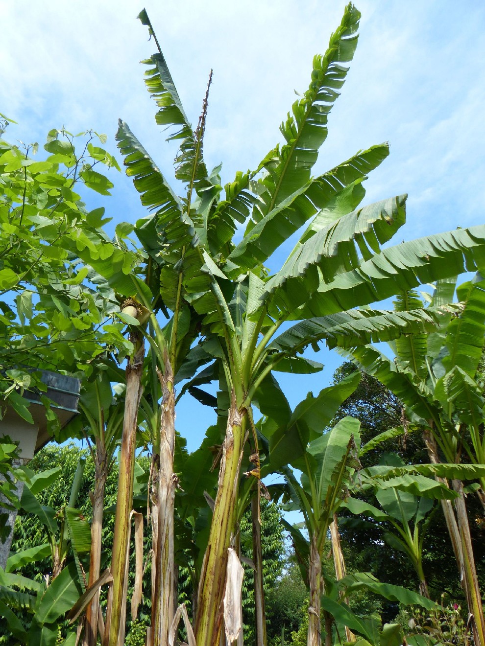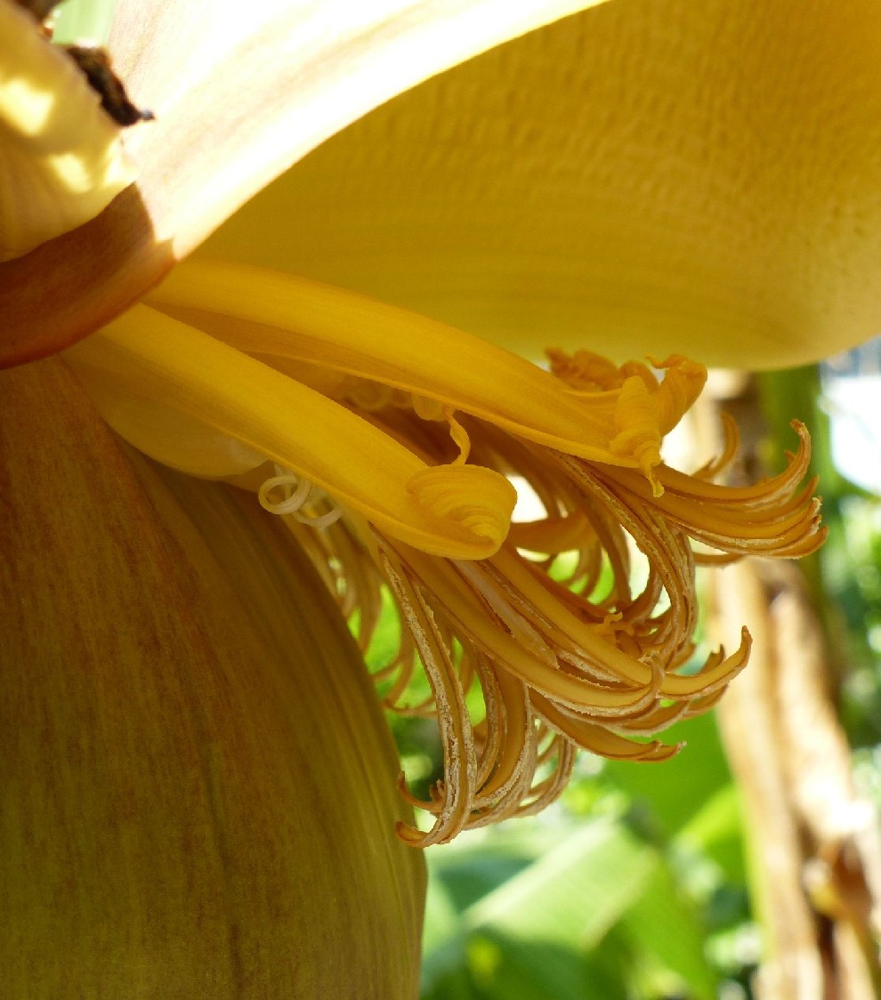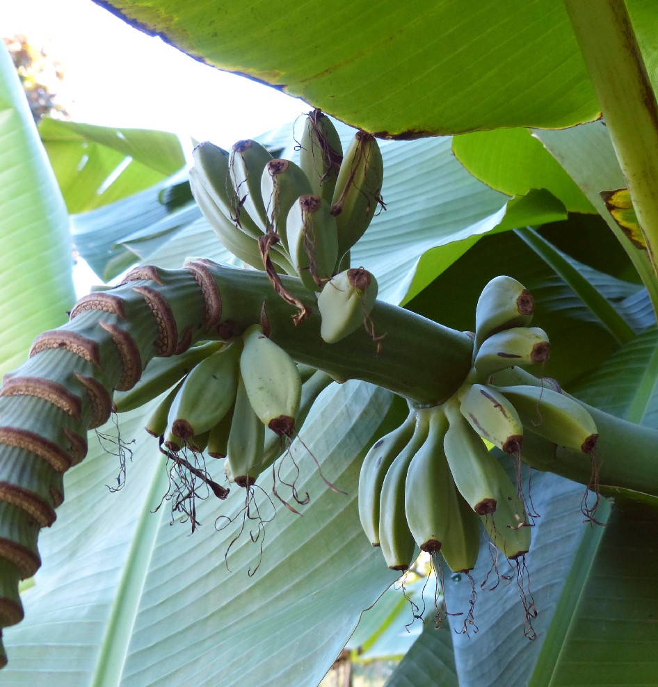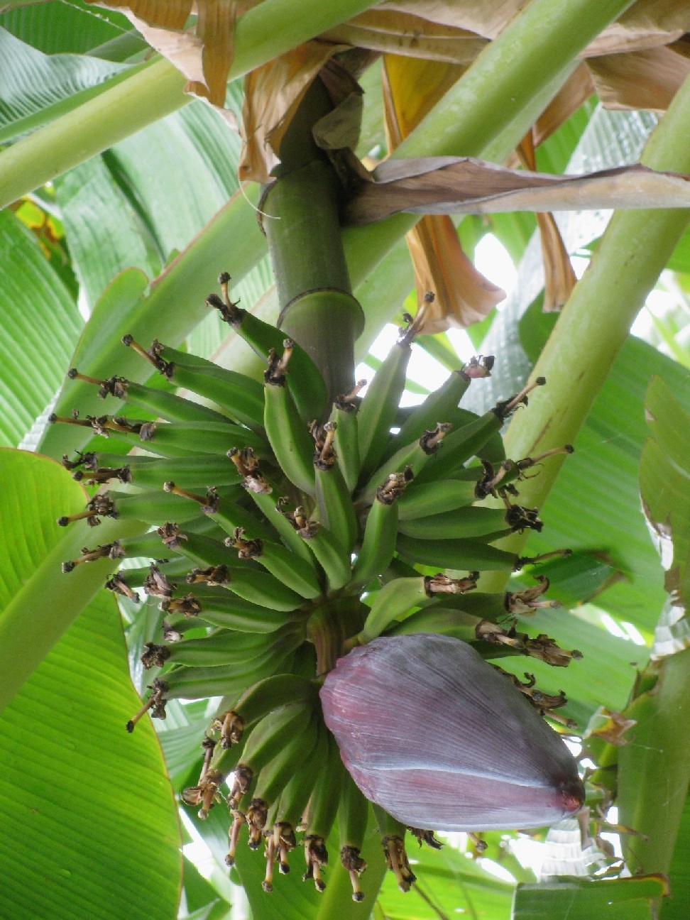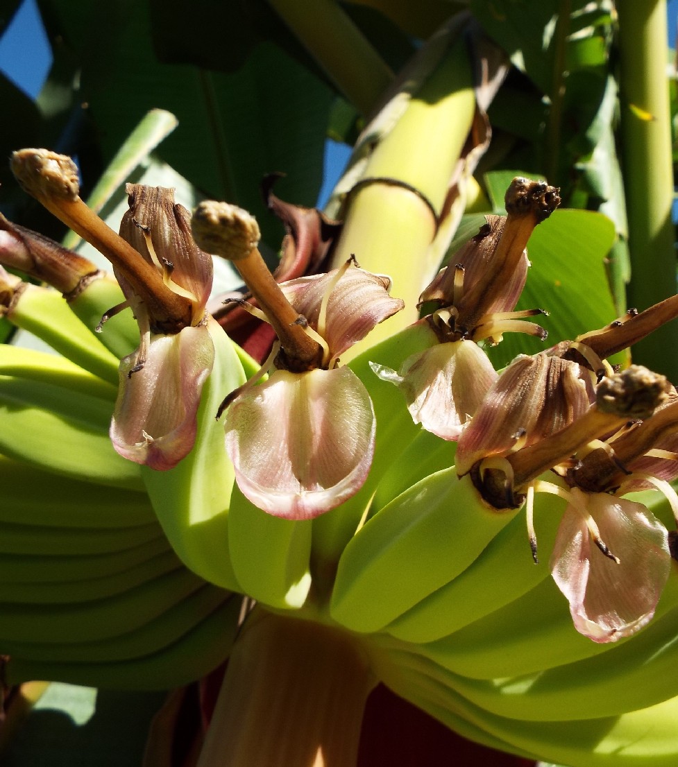 Eine Bananenstaude besteht aus den im oberen Teil angeordneten Früchten, an deren Spitze sich eine glockenähnliche Knospe aus Hochblättern befindet, welche weitere männlich, weibliche oder zwittrige Blüten enthält. Die abgefallenen Hochblätter der männlichen Blüten hinterlassen am Strunk schuppige Narben, pro Hochblatt mit 10 - 16 Blüten in 2 Reihen