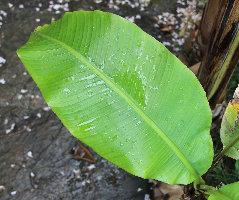 Pseudostamm 2,5 - 4 m hoch, in der Mitte aus einem echten Stamm, der durch die übereinander liegenden Blattscheiden im Umfang beträchtlich erweitert