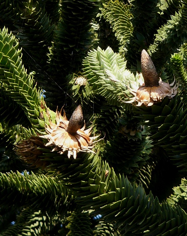 Die weiblichen Zapfen zerfallen nach einer Reifezeit von drei Jahren. In den Zapfen reifen braune, schwere, bis 4 cm lange, essbare Samen ('pinones')
