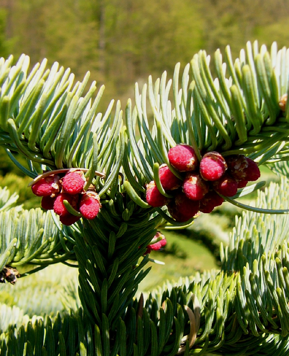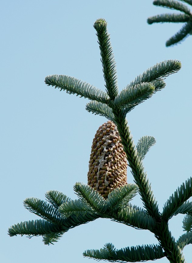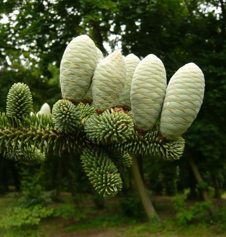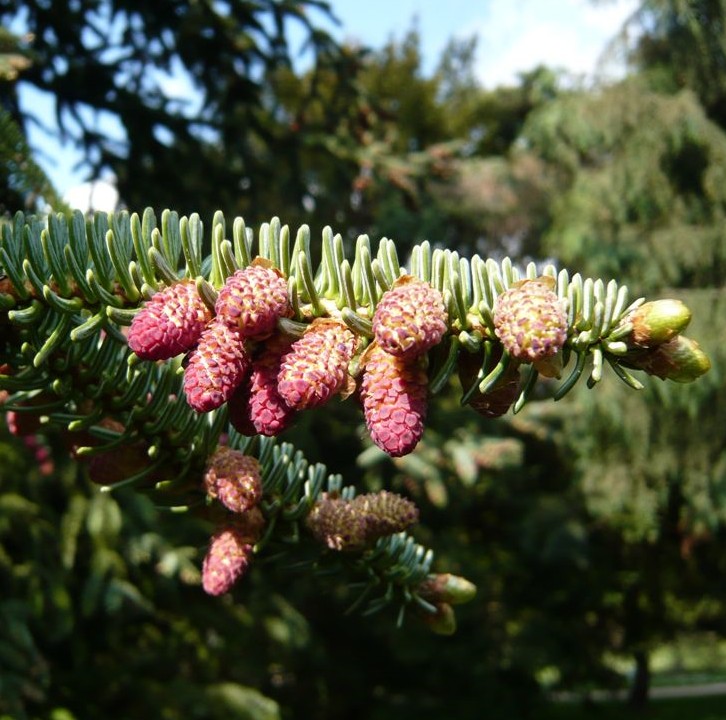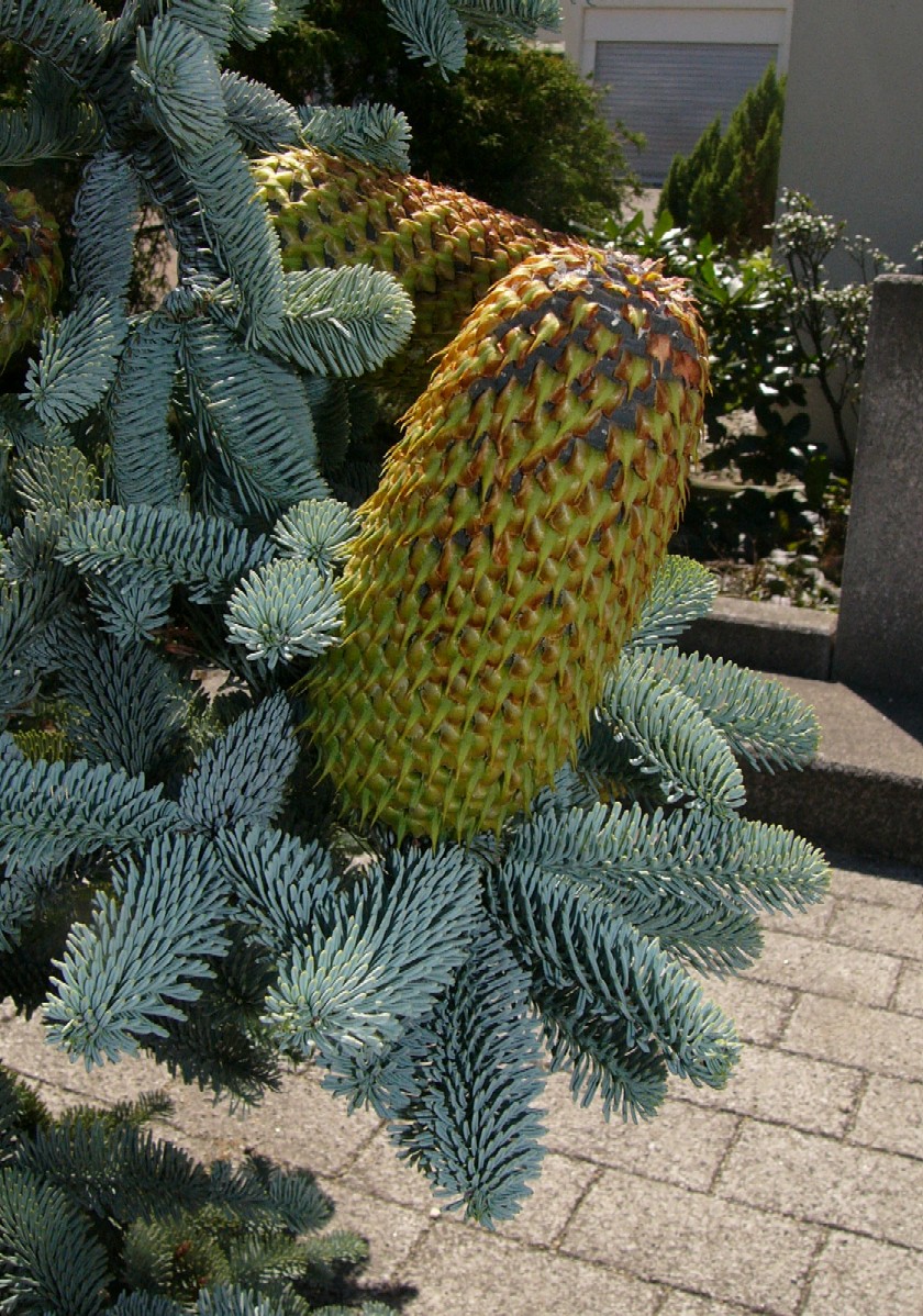 Weibliche Zapfen 10 bis 15 cm lang, 4 - 5 cm dick, jung grün, mit rötlichem oder violettem Reif