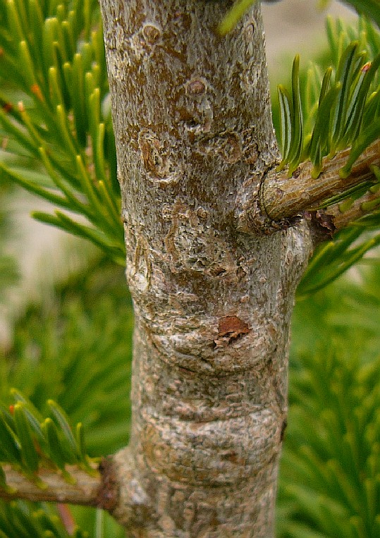 Knospen etwas harzig, untere Schuppen sichtbar Rinde silbergrau bis stumpf rötlich, bricht in rechteckige Platten auf