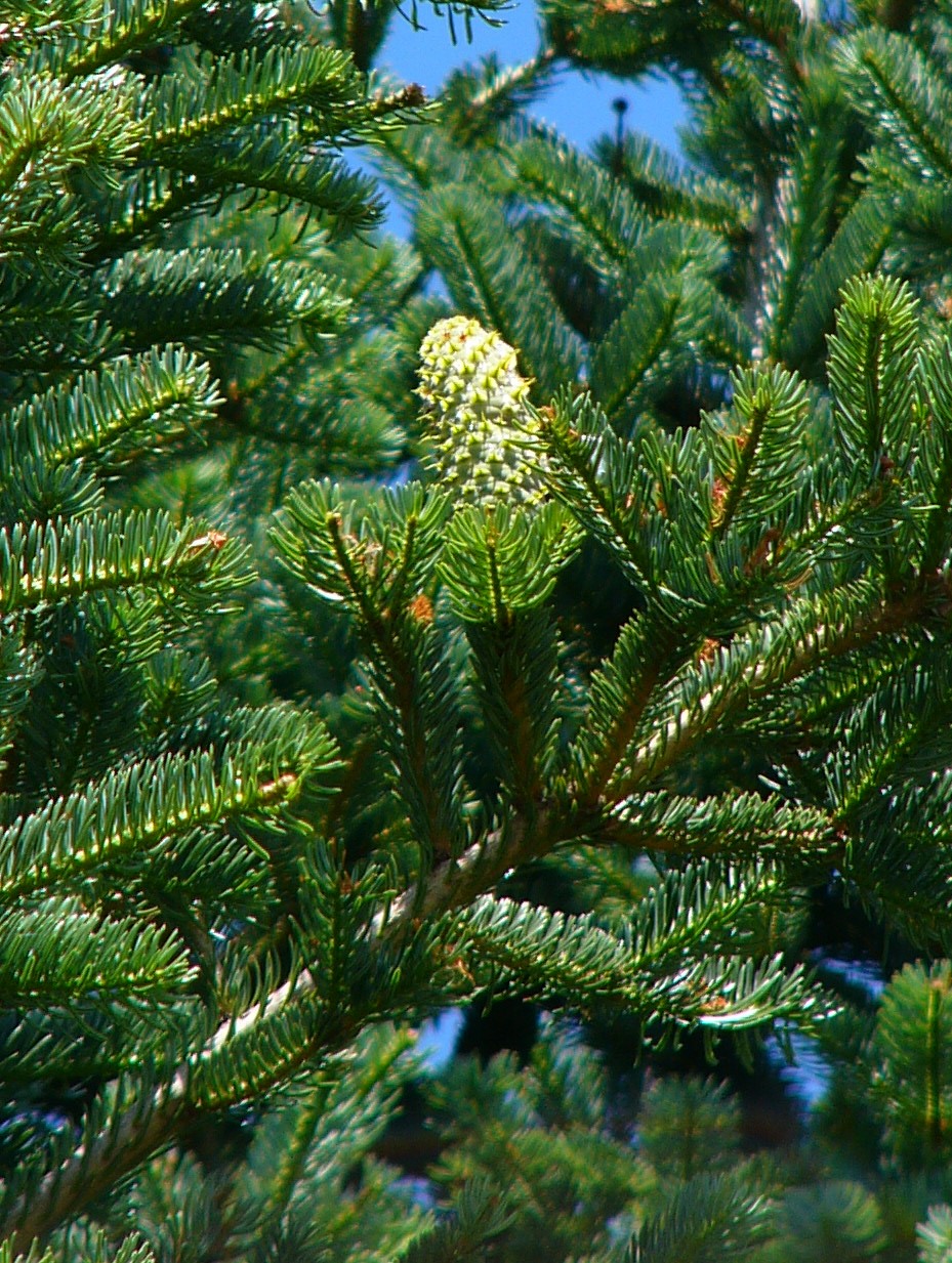 aufrecht, auf dem Baum zerfallend Nadeln mit scheibenförmiger Ansatzstelle ohne herablaufendes Stielchen > Abies (Tanne)