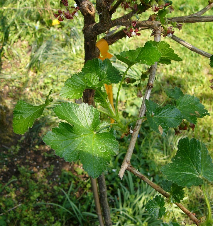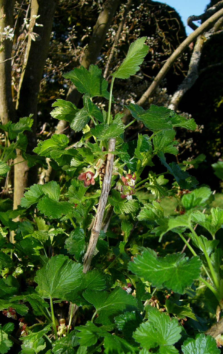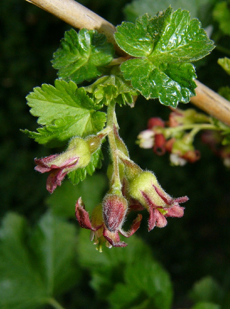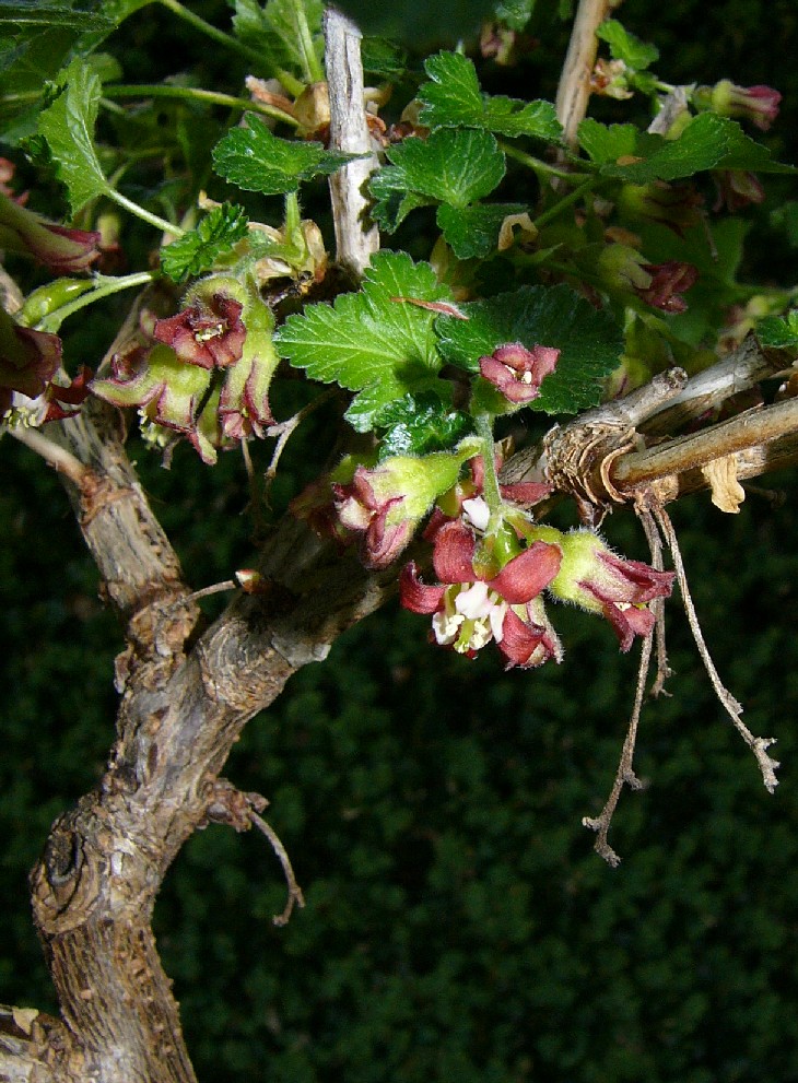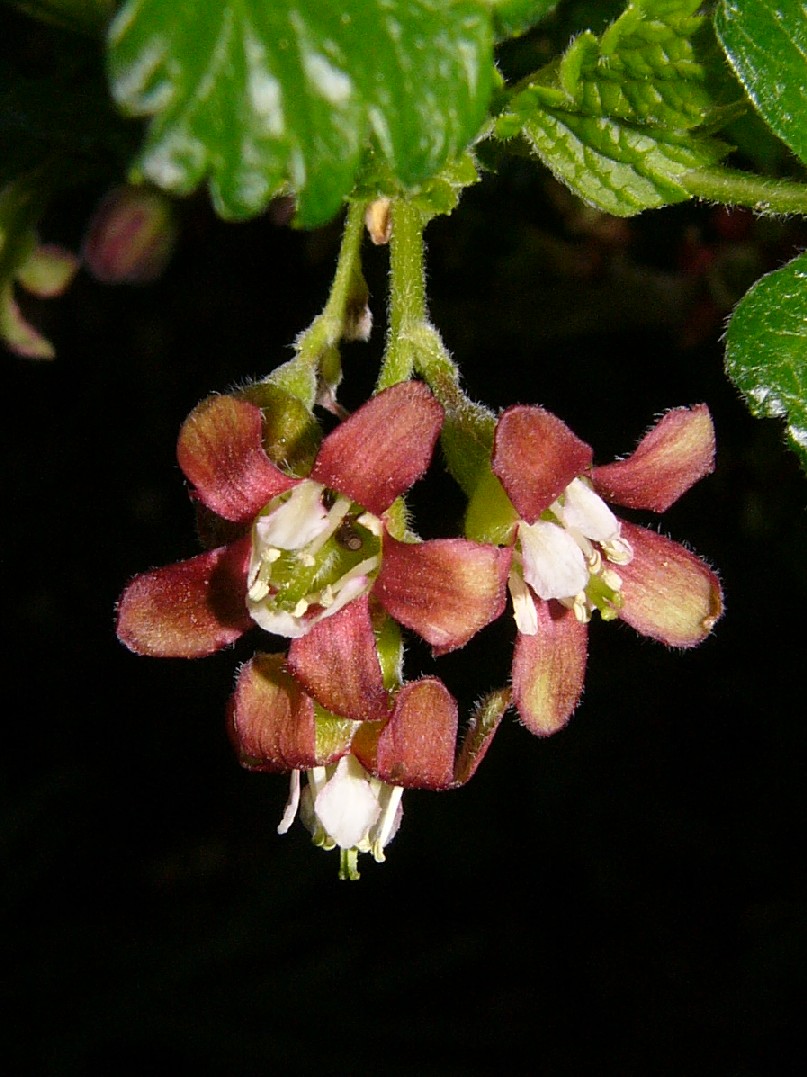 Ribes - Pflanze ohne Stacheln, Blüten innen rotbraun, außen grün