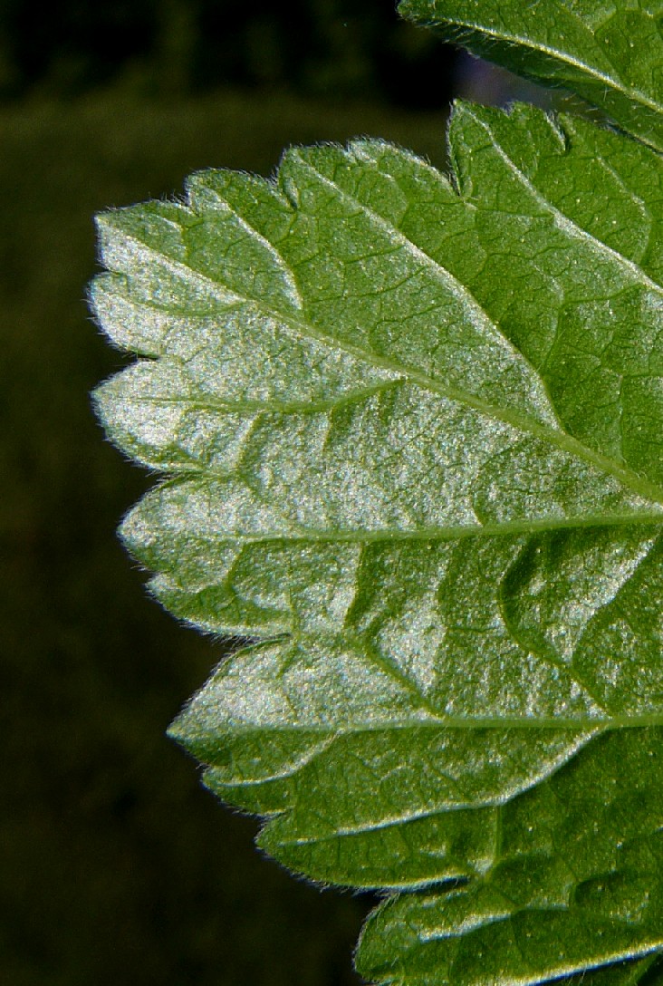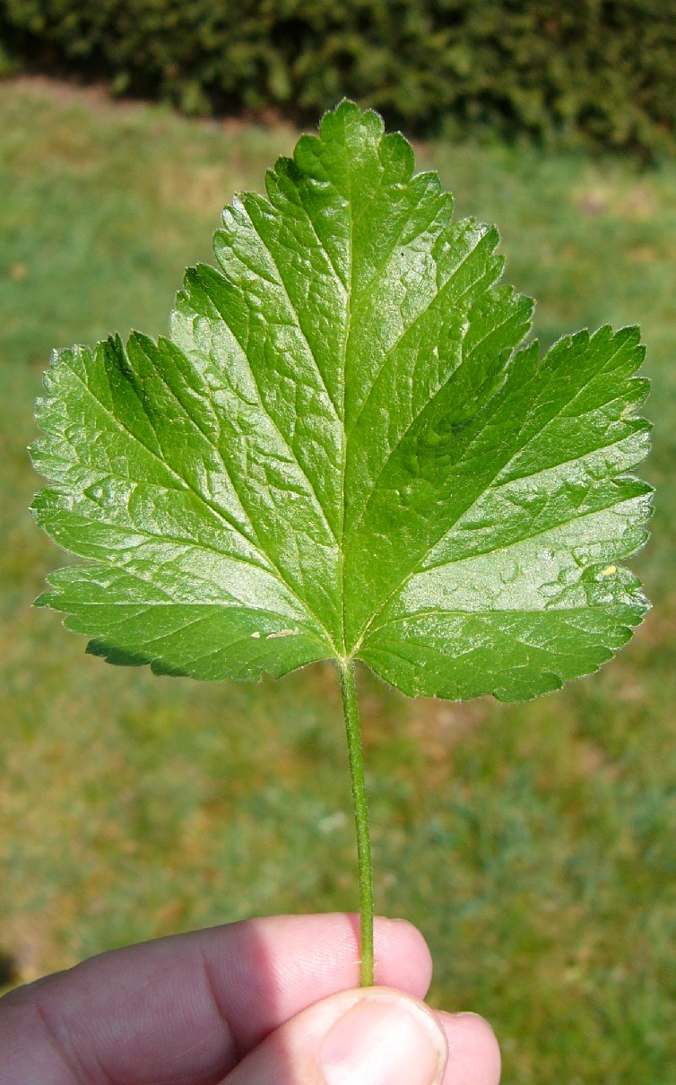 Blätter von den Elternarten deutlich abweichend: aus stark herzförmiger Basis rundlich, meist bis etwa 6 -7 mm lang und breit, gewöhnlich nur seicht 3 -, selten bis 5—lappig mit überwiegend nur zu einem Fünftel oder Viertel (also viel weniger als bei den Eltern) eingeschnittener Spreite, gekerbt, oberseits glänzend, +/- kahl,