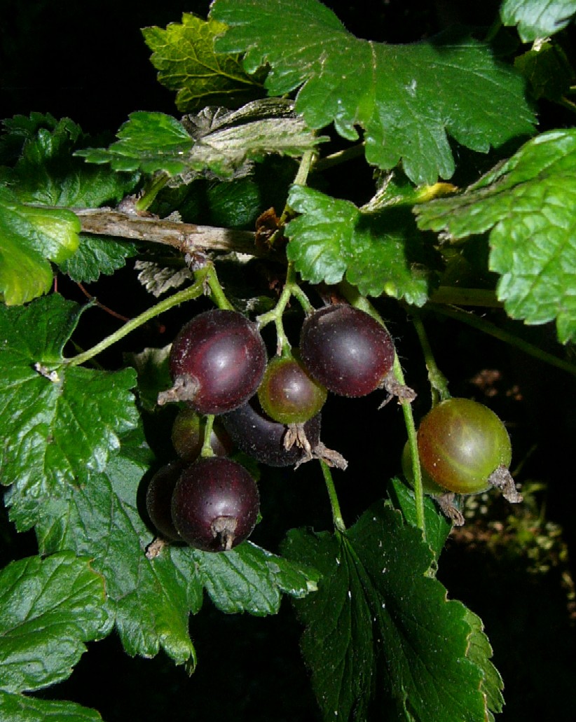 Beeren , schwarz oder dunkelrot, glänzend, +/- kahl, drüsenlos, in Größe und Geschmack zwischen Ribes nigrum und Ribes uva-crispa vermittelnd, ohne das für Ribes nigrum charakteristische Aroma