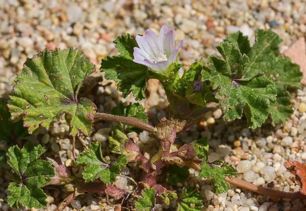 Malva - Kronblätter hell rosa, Blätter gelappt, Blüten klein, hellrosa, Außenkelchblätter dreieckig oder breit oval