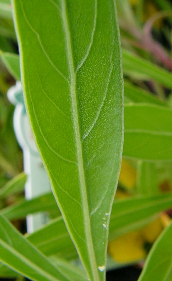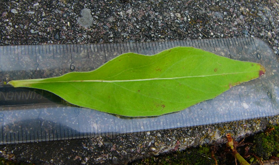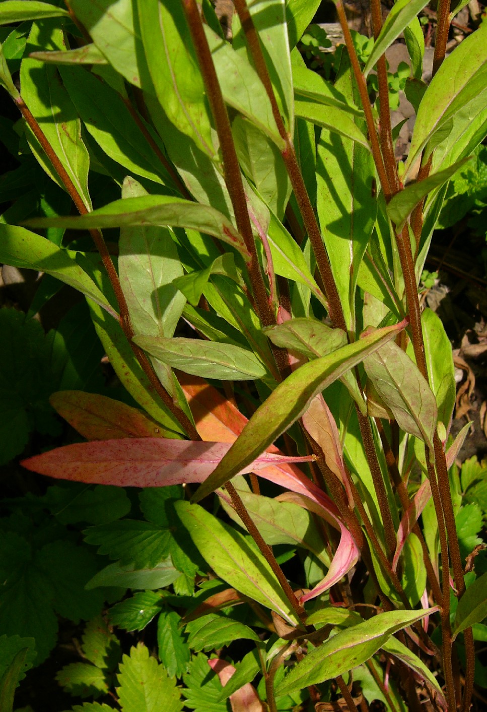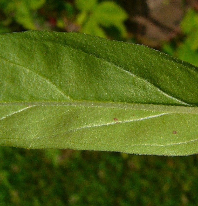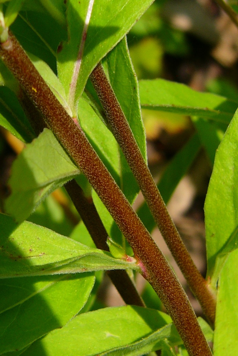 Stängel seidig behaart, zumindest im unteren Teil rot, Blätter lanzettlich, 5 - 10 cm lang, ganzrandig, spitz, lang gestielt