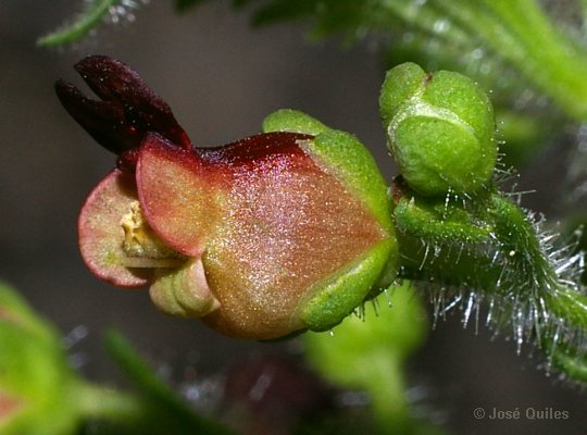 Blüten 8 - 13 mm lang, Kronröhre bauchig, gelblich oder grünlichbraun, Kronoberlippe braunrot, Staubblätter nicht aus der Krone ragend Staminodium eiförmig, ca so lang wie breit Kelchzipfel oval, stumpf, mit deutlichem, ganzrandigen oder gezähntem Hautrand Frucht eiförmig, ledrig Stängel dicht mit anliegenden Drüsenhaaren behaart Blätter meist ungeteilt, selten leierförmig, mit