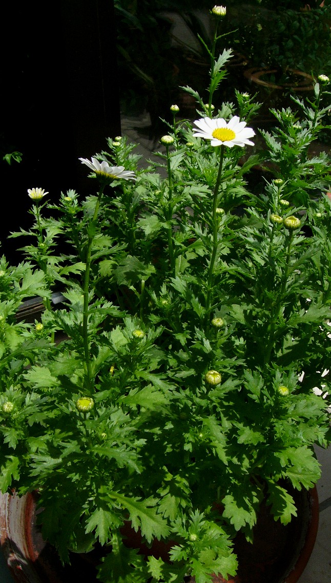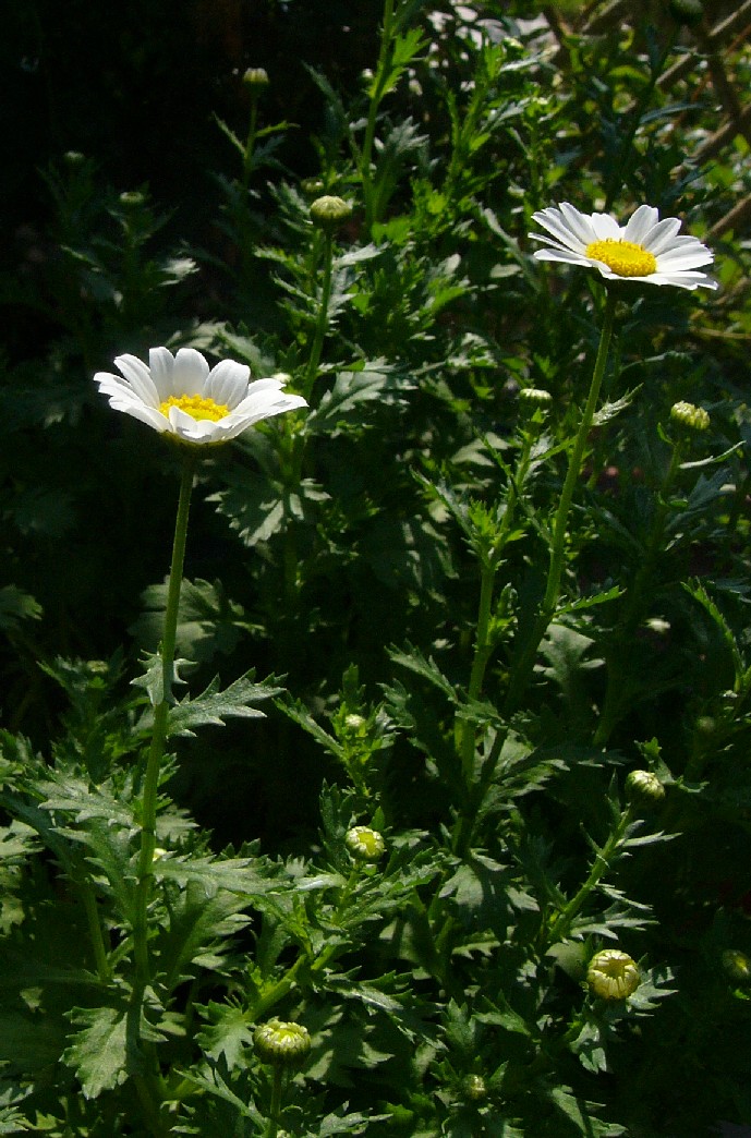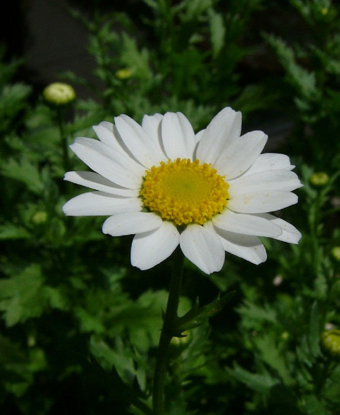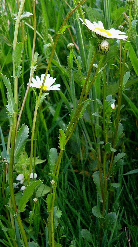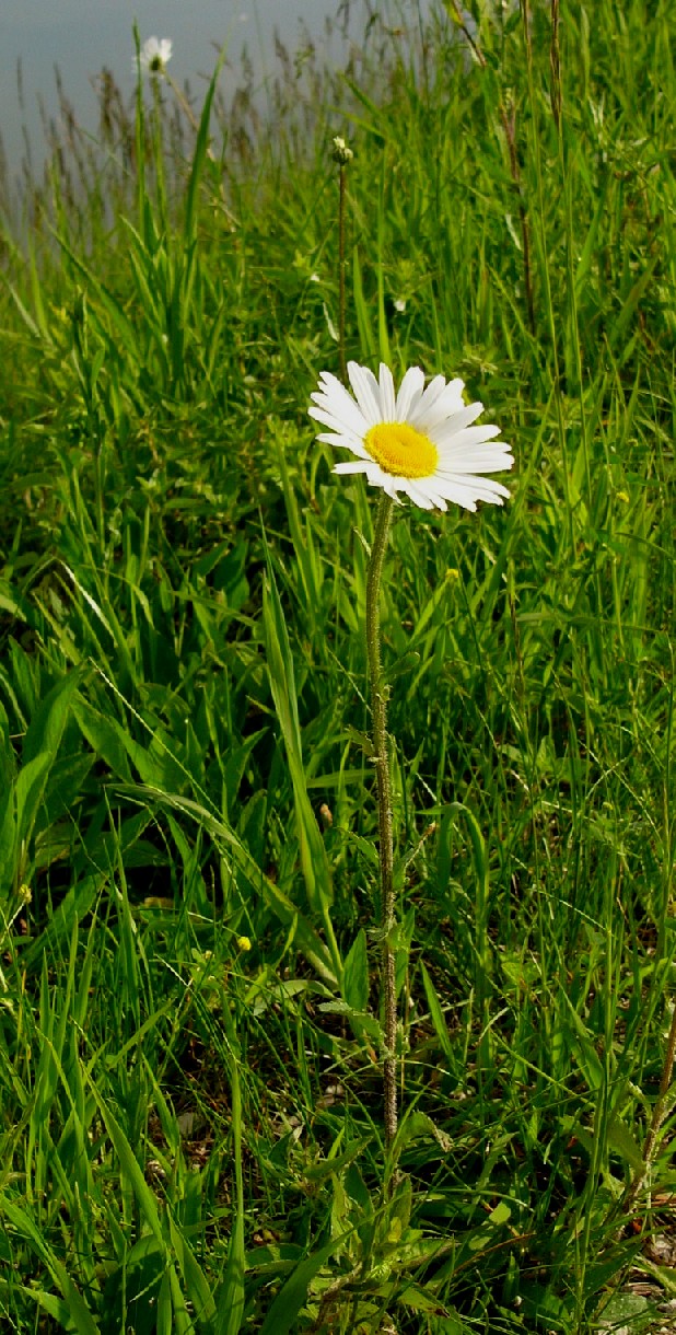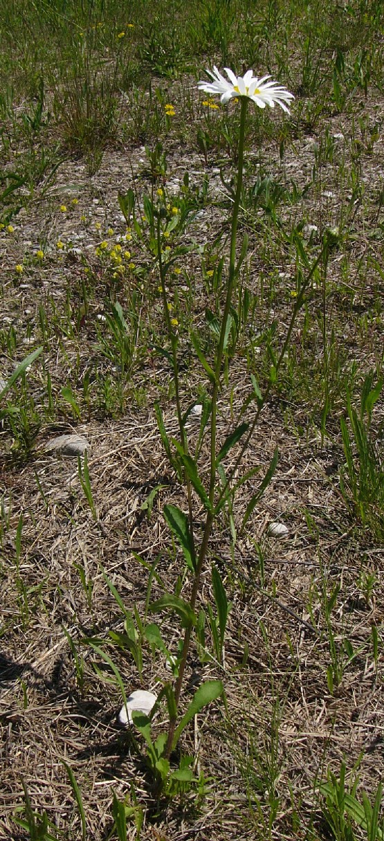 Korbblütler mit weißen Zungen- und gelben Röhrenblüten, Stängel wenigköpfig