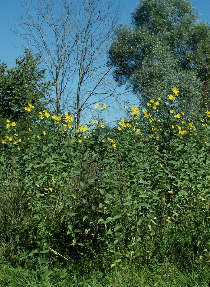 Korbblütler - Pflanze 80 - 250 cm hoch, Blüten gelb, Köpfe mit Röhren- und Zungenblüten, Röhrenblüten nicht über die Zungenblüten erhaben, Blätter ungeteilt, Köpfchen mit mehr als 10 Zungenblüten