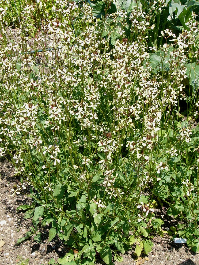 in: Die Pflanze wird wie Diplotaxis tenuifolia und Diplotaxis muralis als Rucola- Salat in Gärten angepflanzt und kann verwildern