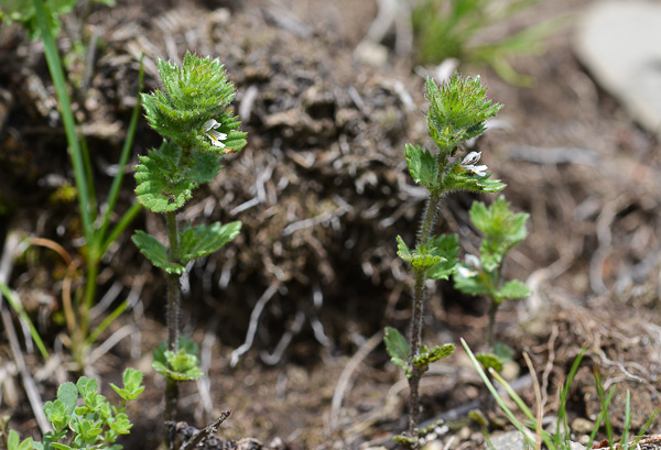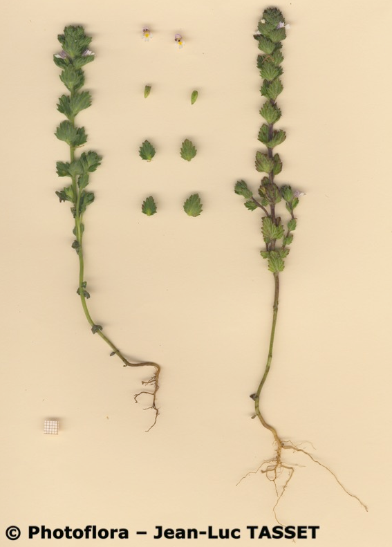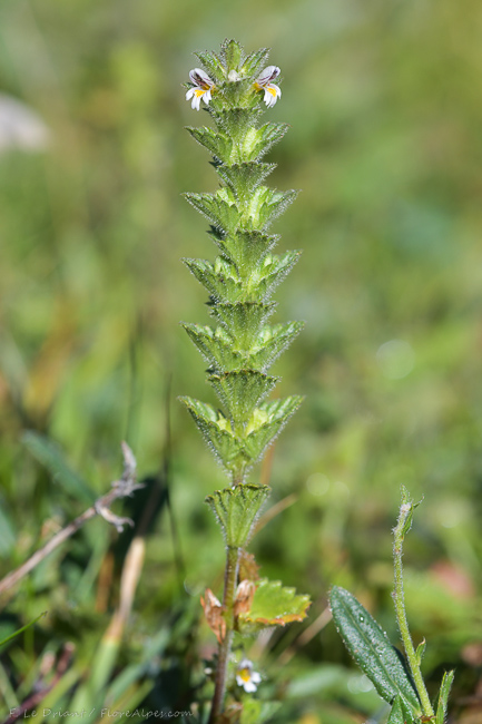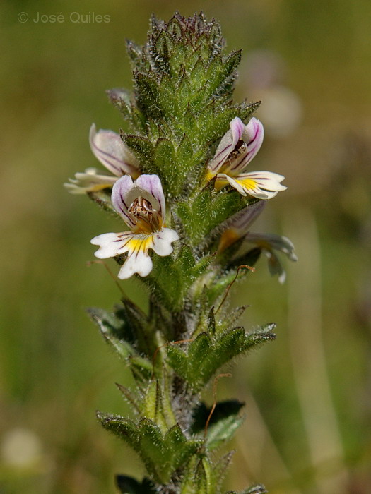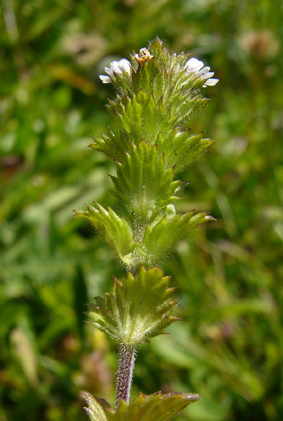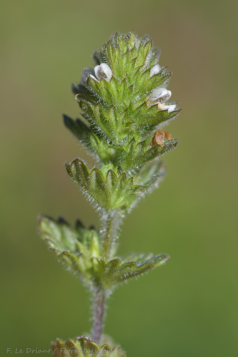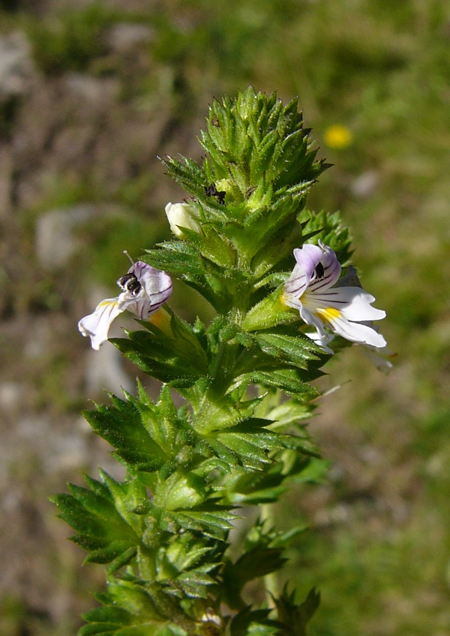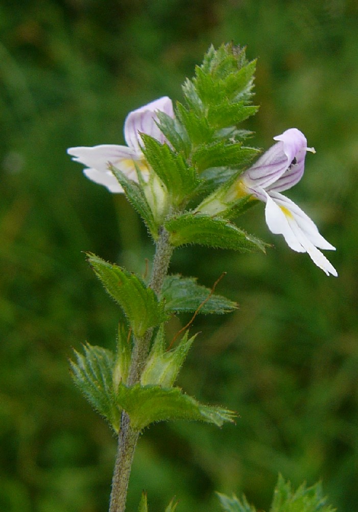 Augentrost - Pflanze mit langen Haaren, Blüten weiß/violett, Blätter 1 - 2 mal so lang wie breit