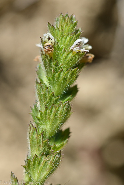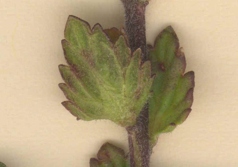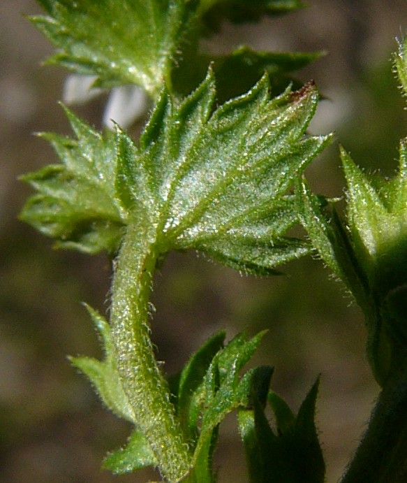 Blätter auf jeder Seite mit 3 - 6 aneinander grenzenden Zähnen, Zähne ca. so lang wie breit, mit langen drüsigen und nichtdrüsigen Haaren die oberen meist spitz, kurzgrannig, die unteren stumpf