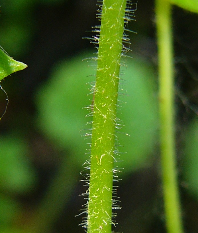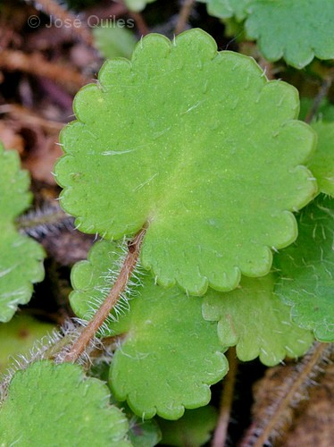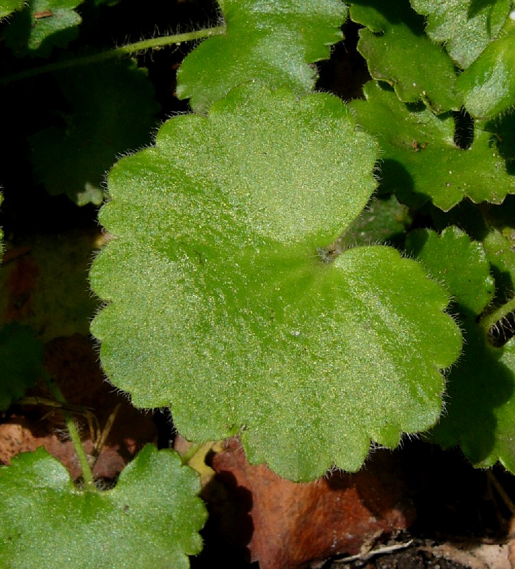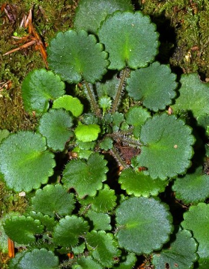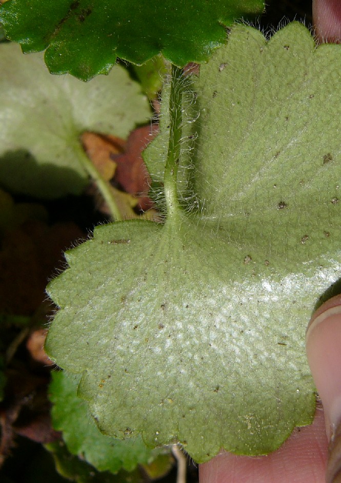 Kronblätter 5 - 9 mm langweiß, mit roten und am Grund mit gelben Punkten Stängel drüsenhaarig Stängelblätter rundlich nierenförmig, gekerbt gezähnt Grundblätter rundlich, 30 - 85 mm im Durchmesser, lang gestielt Grundblätter oft breiter als lang, am Grund herzförmig, gezähnt, weich, nicht ledrig Blattunterseite heller, glänzend, behaart