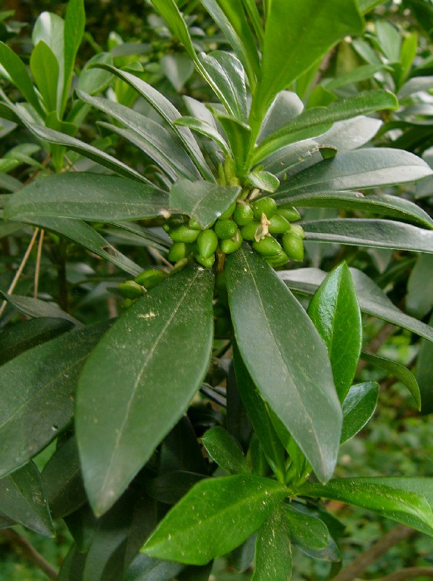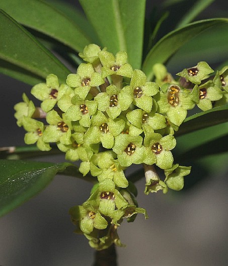 40 - 120 cm großer immergrüner Strauch Blüten gelbgrün, in meist 5- blütigen nickenden Trauben