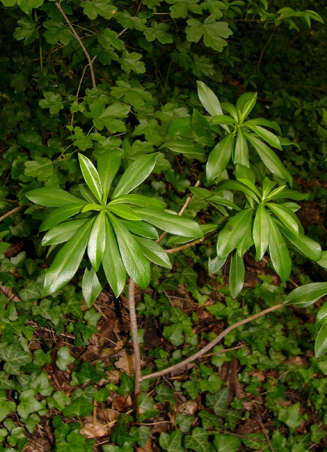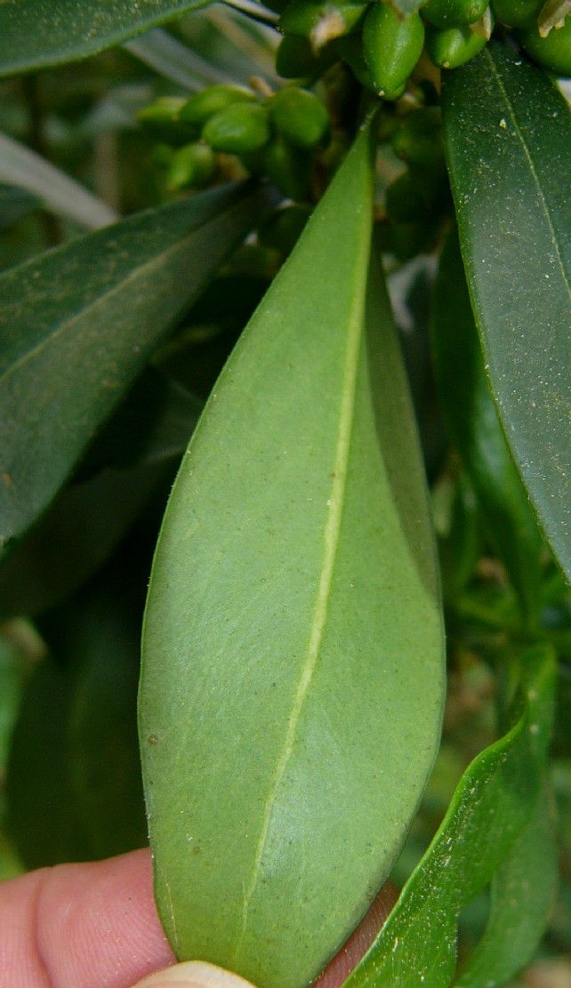 Blätter wintergrün, ledrig, 3 - 10 cm lang, glatt, kahl, ganzrandig
