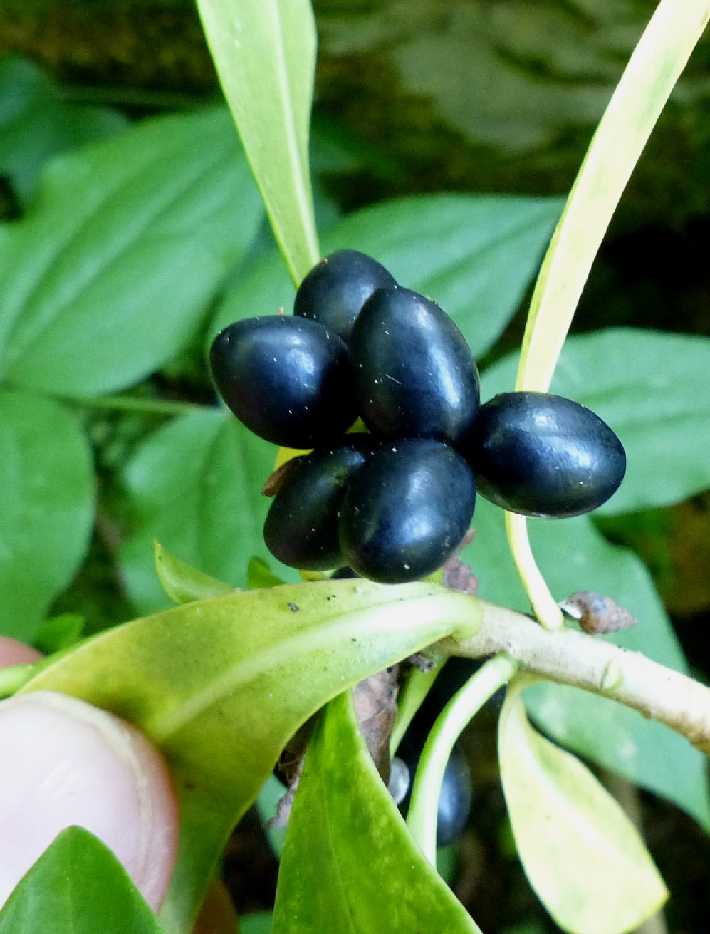 Unreife Frucht grün, in den Blattachsen Reife Früchte schwarz