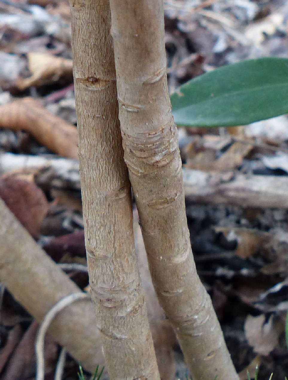 Blätter oberseits glänzend dunkelgrün, unterseits hellgrün, mit kräftigem Mittelnerv Borke älterer Pflanzen hellgrau