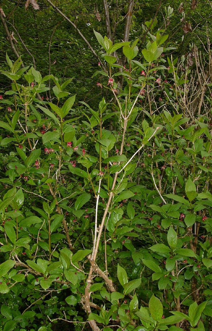 Heckenkirsche - Blüten dorsiventral, trübrot, die 2 Fruchtknoten jedes Blütenpaares sind miteinander verwachsen