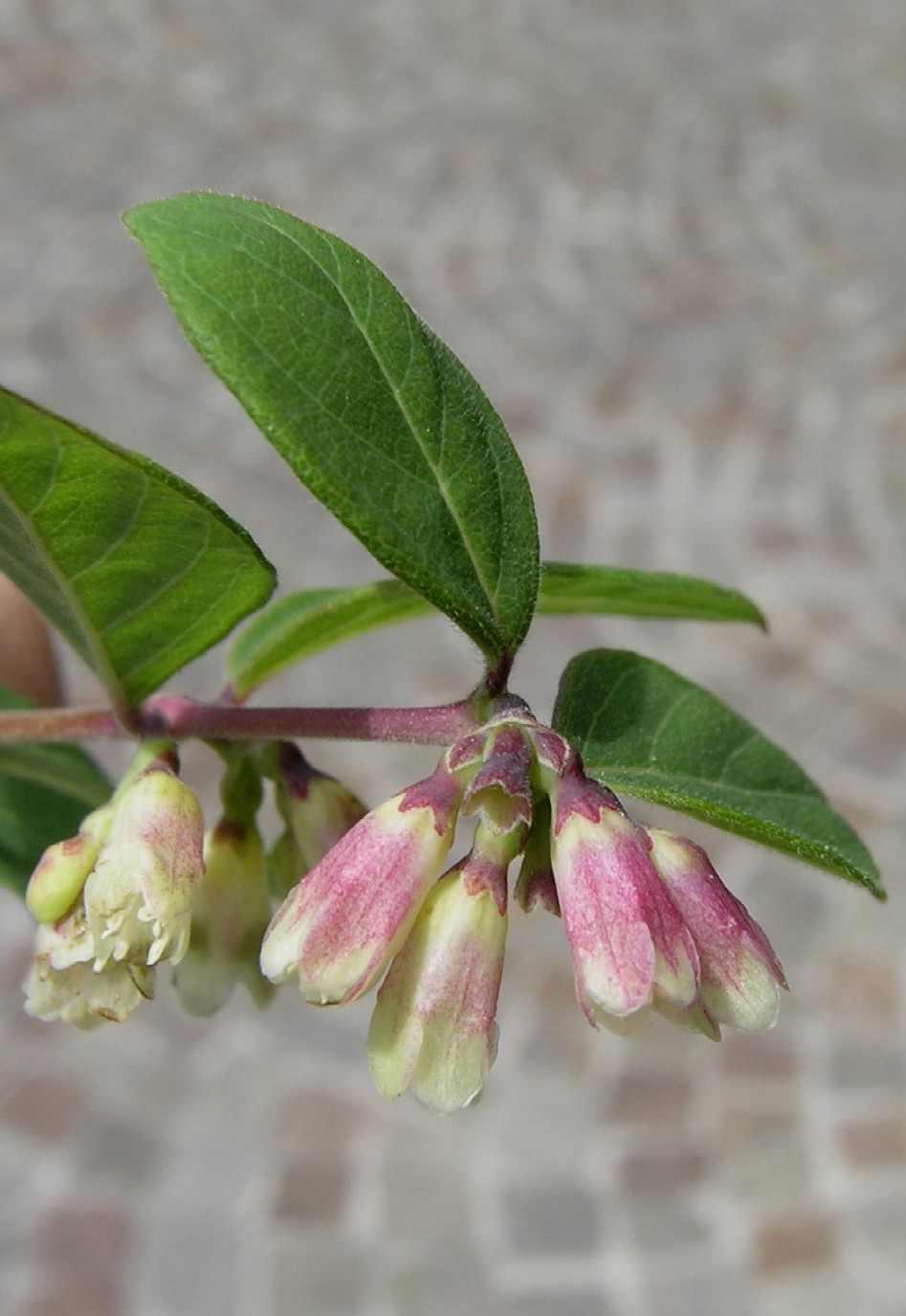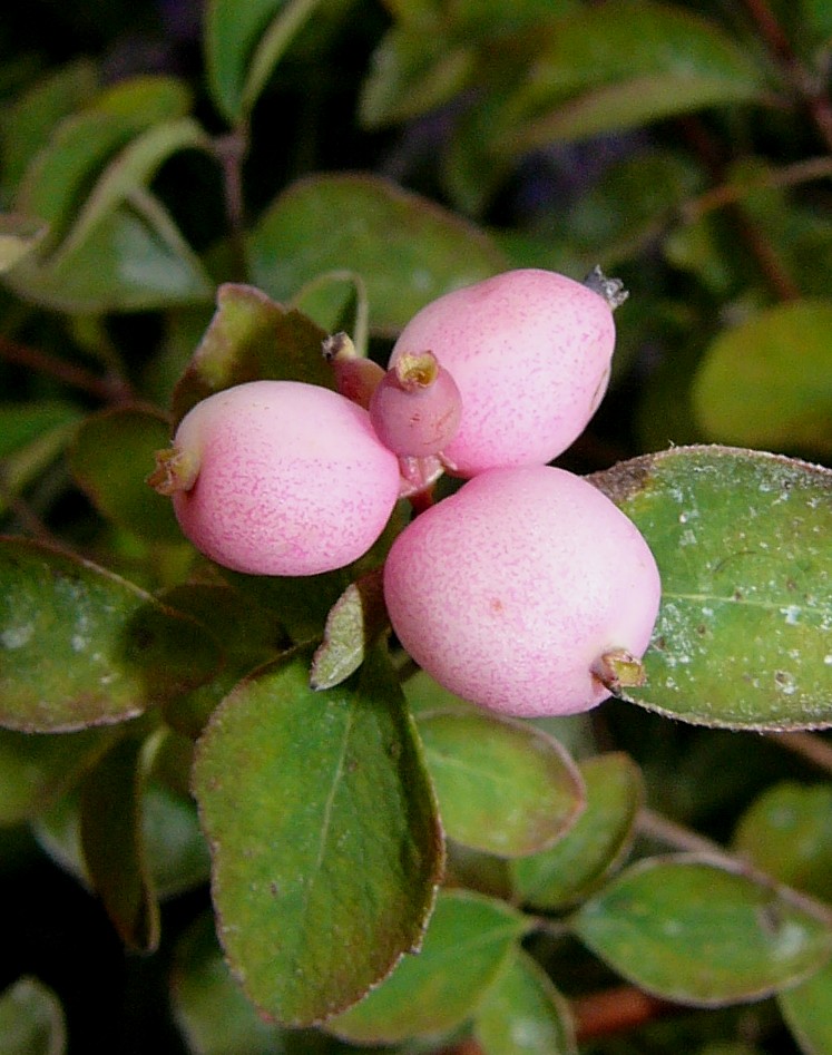 Blüten weiß rosa überlaufen, Blüte innen stark behaart Beeren je nach Sorte pink, weiß mit roten Backen oder violett Beeren 5 - 10 mm groß Blätter gegenständig, grasgrün, rundlich eiförmig Untere Blätter bis 4 cm lang Blätter unterseits blaugrün,